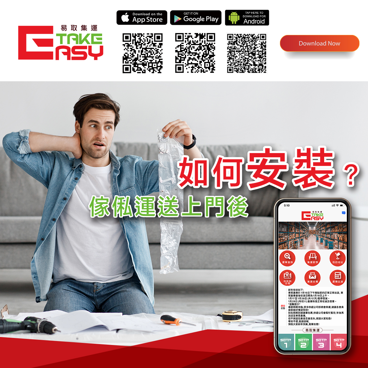 Easy Take易取集運特設集運安裝一條龍服務。幫你將傢俬運送上門之外,仲可以請我哋嘅專業裝修師傅幫大家組裝傢俬。